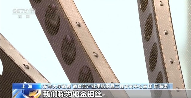 东华大学教授、教育部产业用纺织品工程研究中心主任 陈南梁:我们采用的原料我们称为镀金钼丝,那么也就是在钼丝的基础上,表面镀了金,因为金的反射率是非常好的。对钼丝来说,钼丝非常细,大概15到30个μ(微米),还不到头发丝直径的四分之一,所以它的拉制,本身具有很大的难度。另外表面还有镀金,那么镀金以后它要保持一定的牢度,我们掺杂了一些有机元素,一方面提高了我们金属原材料的韧性,另外也让它的表面具有更好的亲和力,这样使我们钼丝镀金以后在编织过程当中是非常坚固。经编编织过程也是相对非常精致和复杂的。首先我们要进行并线,因为它太细了,我们发明了一种并股加捻(并线加捻)技术,金属丝三根并在一起,结构非常稳定。