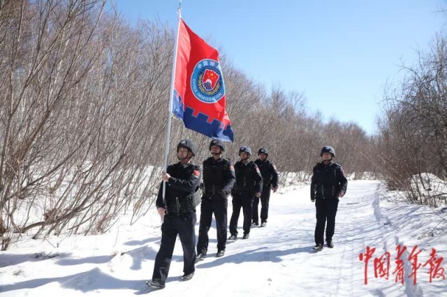 3月13日,宝格达山边境派出所巡逻队民警在林间巡逻。中青报·中青网记者 石佳/摄