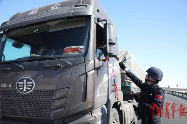 3月13日,宝格达山边境派出所民警在国道331线上巡查通行车辆。中青报·中青网记者 石佳/摄