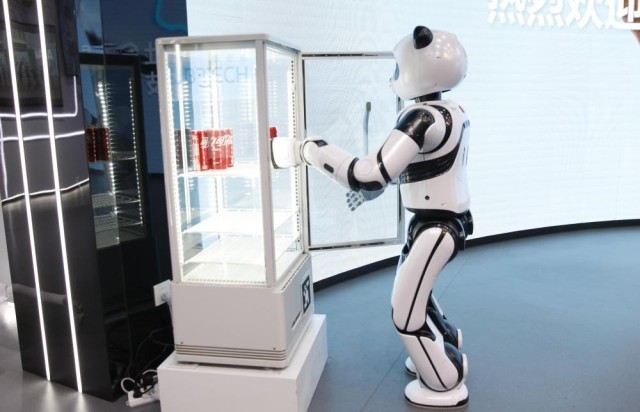 在深圳市优必选科技股份有限公司展厅内,熊猫机器人从冰柜中取出一听可乐(2024年2月29日摄)。新华社记者 洪泽华 摄
