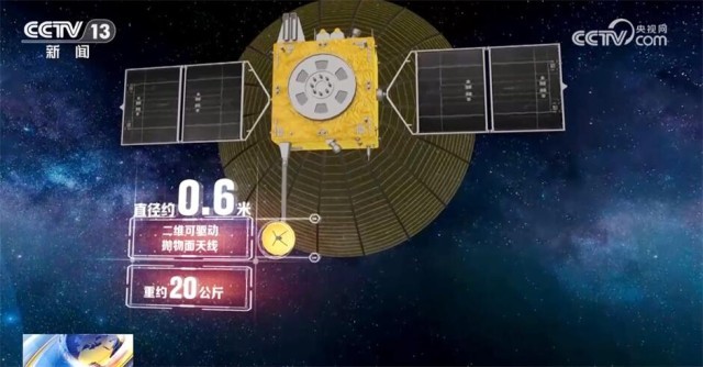 而在鹊桥二号中继星上还有一个“小伞”,叫二维可驱动抛物面天线。它的直径和重量都很小,直径大约只有0.6米、重约20公斤。在太空中,通过两轴驱动机构,保证每时每刻都能指向地面数据接收站。