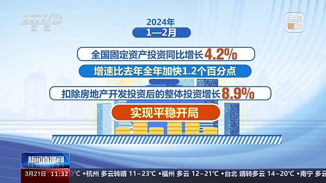国家发展和改革委员会副主任刘苏社介绍,今年以来,国家发展改革委会同有关方面,充分发挥政府投资的带动放大效应,积极支持社会资本参与重大项目建设,着力扩大有效益的投资。1—2月,全国固定资产投资同比增长4.2%,增速比去年全年加快1.2个百分点;扣除房地产开发投资后的整体投资增长8.9%,实现平稳开局。