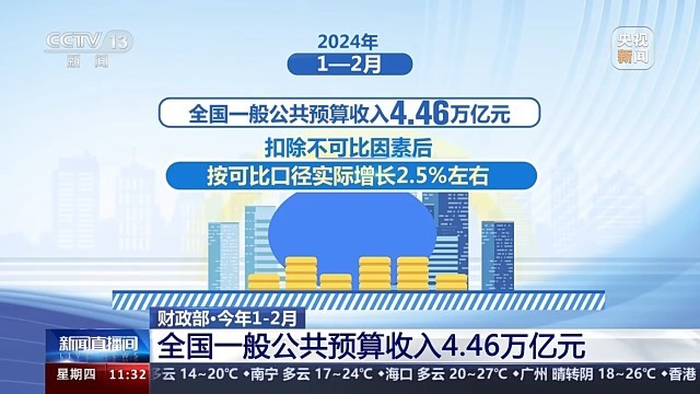 财政部副部长廖岷介绍,今年1—2月,全国一般公共预算收入4.46万亿元,扣除不可比因素后,按可比口径实际增长2.5%左右,保持恢复性增长,与宏观经济稳中向好的态势基本保持一致;全国一般公共预算支出同比增长6.7%,完成全年预算的15.3%,支出进度为近5年同期最快。