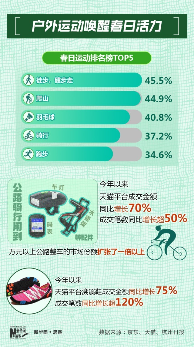 春日已至,又迎来户外运动的好时节。京东数据显示,徒步、健步走、爬山、羽毛球、骑行等运动项目位列春日运动排名榜前五位。越来越多的网友认为,户外运动除了能让“身体更健康”,还能让自己“结交到更多的朋友”“生活态度更积极”。
