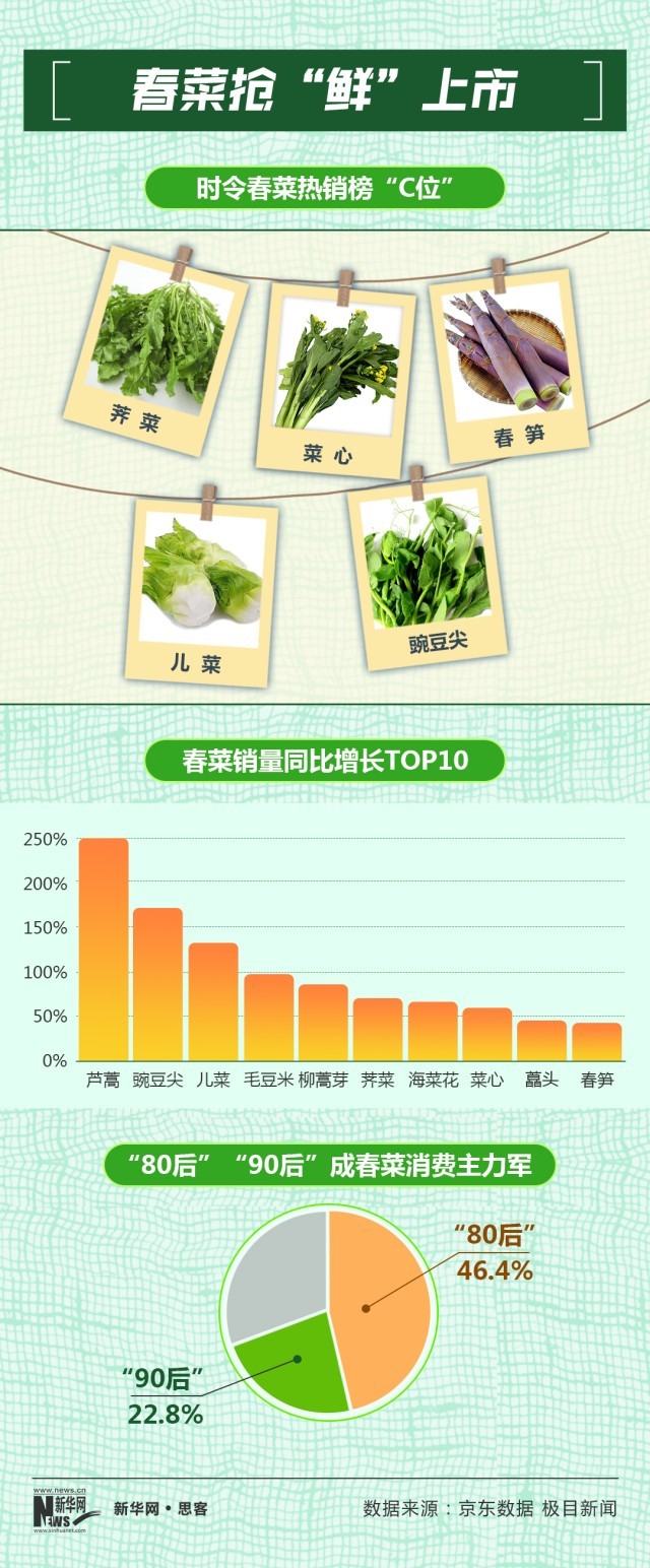 又到一年尝春季,各种新鲜春菜纷纷上市,为消费者餐桌增添更多春天的味道。京东数据显示荠菜、菜心、春笋、儿菜、豌豆尖占据时令春菜热销榜“C位”,而北京、广东、上海、江苏、浙江成为春菜消费大省。