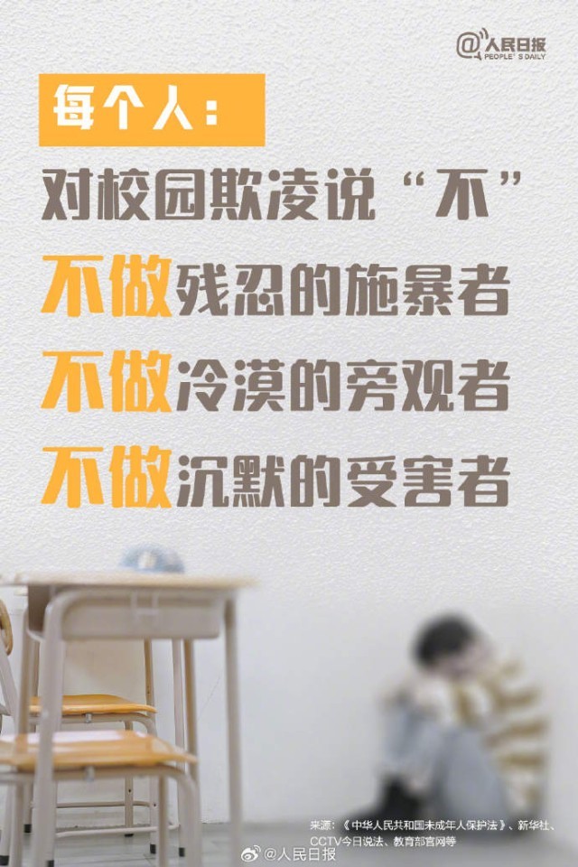 近年来,校园欺凌事件不时刺痛人们的神经。校园欺凌绝不是寻常打闹,家长、教师、学校……各方该如何担负起职责?今天是全国中小学生安全教育日,一起对校园欺凌说“不”↓↓守护“少年的你”,任何人都不是旁观者。