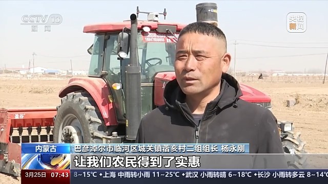 内蒙古巴彦淖尔市临河区城关镇蓿亥村二组组长 杨永刚:国家的农机购置补贴政策,让我们农民得到了实惠,播种机精量下种,出苗率高。