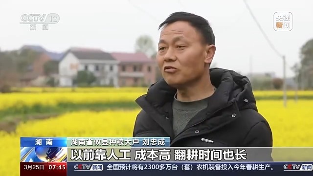 湖南省攸县种粮大户 刘忠成:以前靠人工,成本高翻耕时间也长,无法在节令内完成大面积种植。现在实现了机械化,作业效率是人工的10多倍。