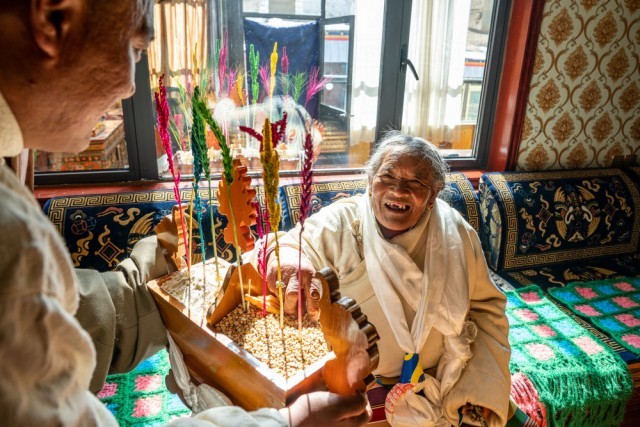 今年藏历新年,斯曲旺姆的儿女们从四面八方带着各自的小家庭来甲根村团聚。孩子们依次给老人献上哈达,敬上青稞酒,被围坐在中间的斯曲旺姆,身边满是欢声笑语。
