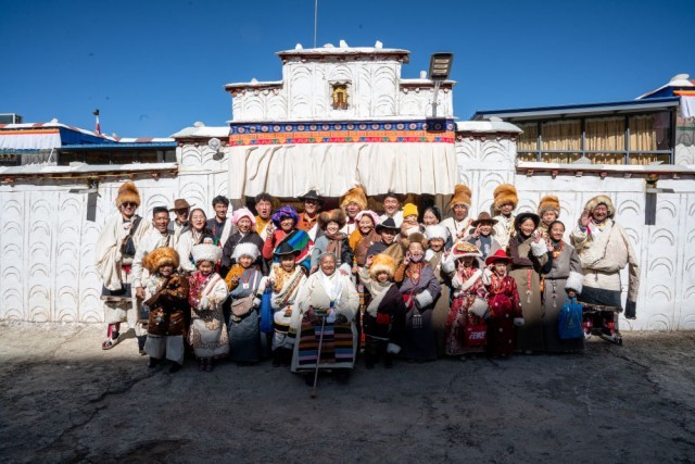 在西藏拉萨市当雄县公塘乡甲根村,斯曲旺姆(前中)和家人们一起拍摄全家福(2月10日摄)。新华社记者 丁增尼达 摄