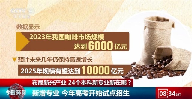 那么,这些新专业到底会讲授什么内容呢?总台记者在云南农业大学采访时发现,新增设的咖啡科学与工程专业今年计划招收60名学生。2023年,我国咖啡市场规模达到6000亿元,预计到2025年,规模有望达到10000亿元。而与此同时,在几大招聘网站上,咖啡培训师、咖啡师主管等岗位仍有大量空缺。