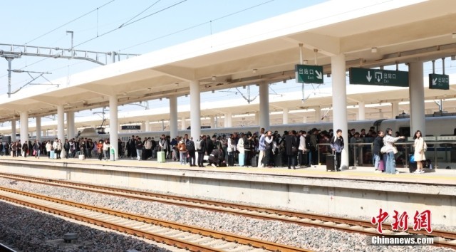 4月6日,铁路连云港站,旅客搭乘动车组列车出行。