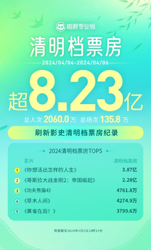 央视网消息:据猫眼专业版数据,截至4月6日18时14分,2024年清明档(4月4日—4月6日)总票房突破8.23亿,超2021年清明档票房成绩,刷新中国影史清明档票房纪录。