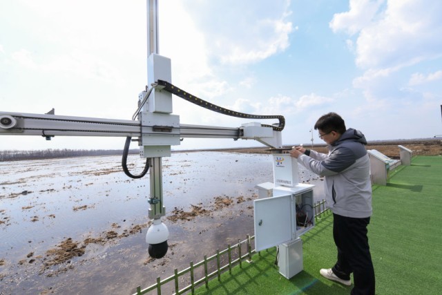 2024年4月3日,在黑龙江北大荒农业股份有限公司友谊分公司一地块,友谊分公司工作人员在检测大数据和物联网技术终端。