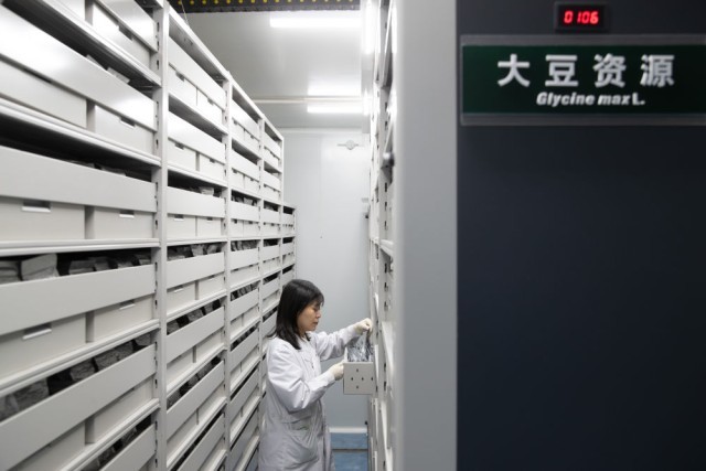 2024年4月2日,工作人员在国家寒带作物及大豆种质资源中期库(哈尔滨)内查看大豆种质情况。