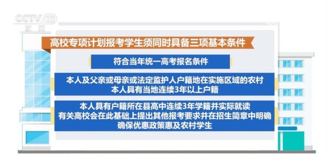 “高校专项计划”报考学生须同时具备三项基本条件:符合当年统一高考报名条件;本人及父亲或母亲或法定监护人户籍地在实施区域的农村,本人具有当地连续3年以上户籍;本人具有户籍所在县高中连续3年学籍并实际就读。有关高校会在此基础上提出其他报考要求并在招生简章中明确,确保优惠政策惠及农村学生。