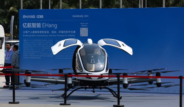 在第四届消博会上展出的无人驾驶载人航空器。新华社记者杨冠宇 摄