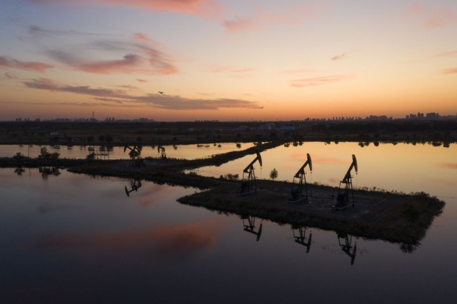 2019年9月27日拍摄的大庆油田第一采油厂的井排。