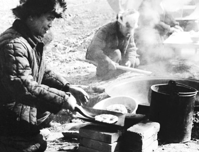 职工用铁锹当大勺做饭。