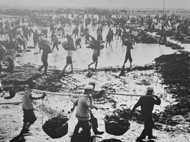 1971年,大庆石油会战的标杆队——1202钻井队工人在新油田用人抬肩扛的办法建井场。