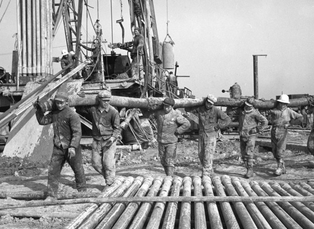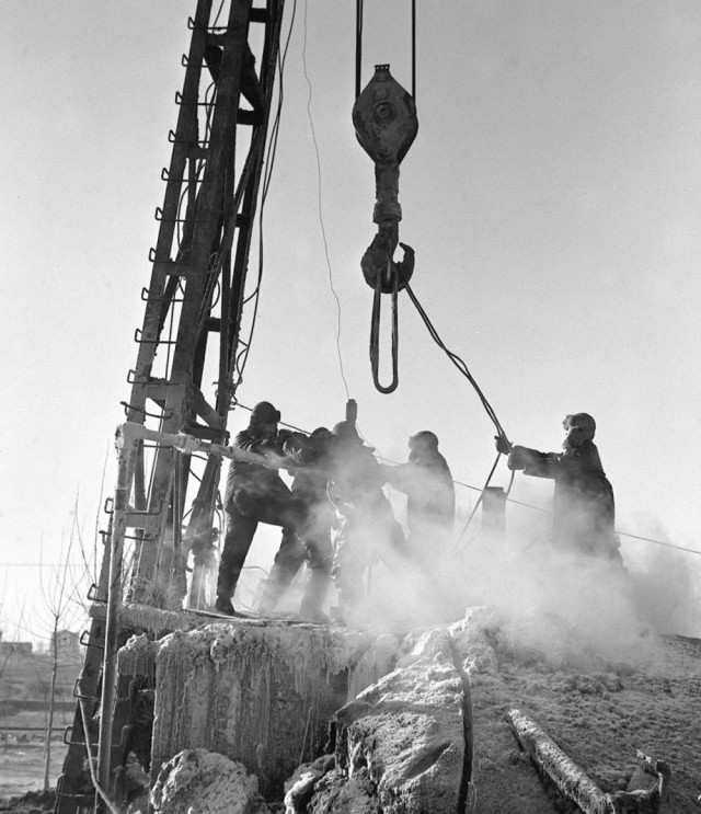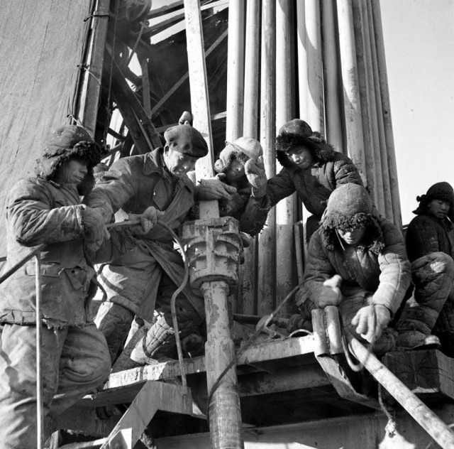 20世纪七十年代,大庆油田钻井工人在严冬里进行作业。