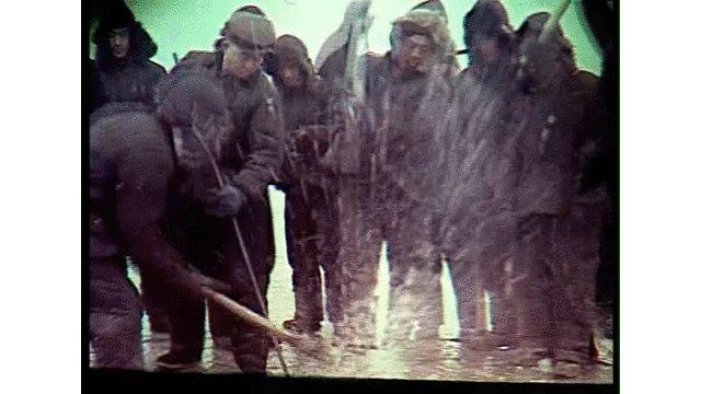 王进喜带领工人们破冰取水。