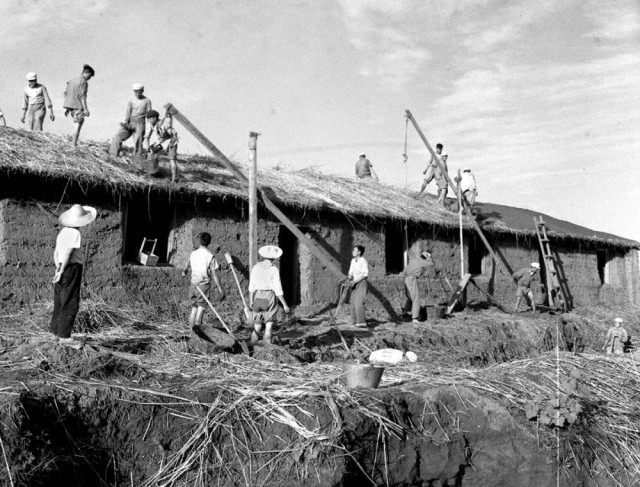 大庆油田建设初期,职工们自己动手盖房屋。