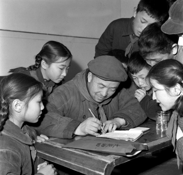 1966年,王进喜在北京少年儿童科学馆为孩子签字,勉励孩子们努力奋斗。