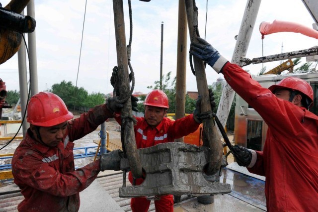 2011年6月1日,李新民(中)帮助1205钻井队队员打井。