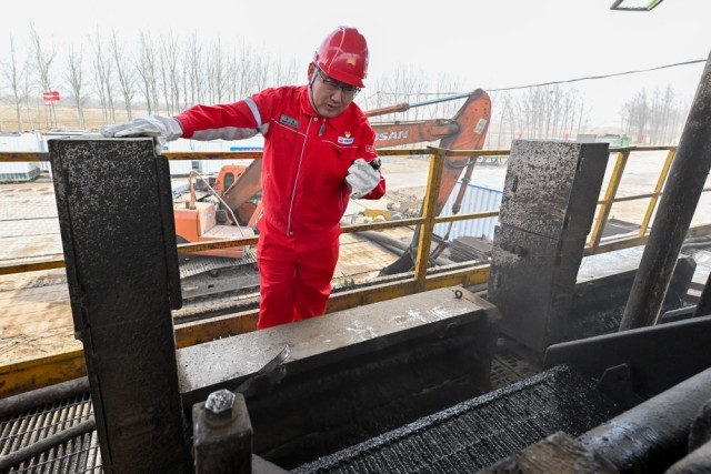 2024年3月28日,1205钻井队队长张晶(左)进行日常巡检中查看振动筛上的岩样。