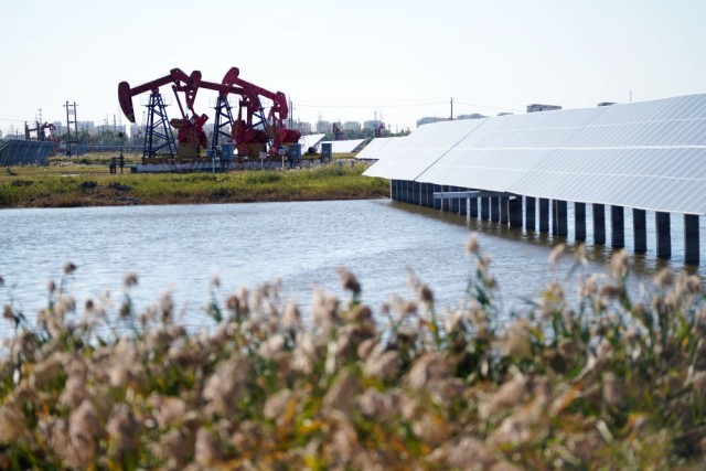 2023年9月19日,在黑龙江大庆油田星火水面光伏电站,电站设施与附近的抽油机相得益彰。