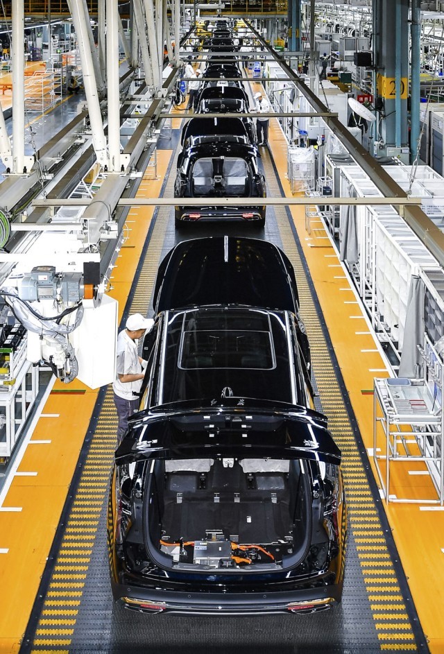 在位于吉林长春的中国一汽红旗制造中心蔚山厂区总装车间内,工人对一汽红旗混合动力汽车进行装配作业(4月24日摄)。