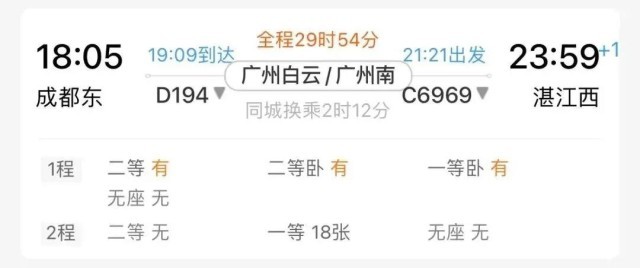 举个例子:成都—湛江直达车票已售完,旅客可选择中转换乘的方式出行,第一程成都—广州白云、第二程广州南—湛江西,广州白云与广州南两车站间,需要通过其他交通方式前往换乘。