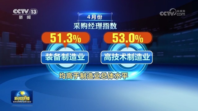 新动能继续较快扩张。4月份装备制造业和高技术制造业采购经理指数分别为51.3%和53.0%,均高于制造业总体水平。