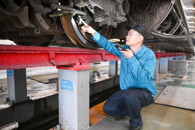 只见他时而俯身、时而下蹲,面对动车组故障排查格外仔细,手电光所到之处,小到一颗螺丝,大到每项设备,他都细查秋毫,进行一一比对。“‘五一’小长假期间,动车组白天都上线载客,夜间检修任务量较平时增长近20%,在检修作业的2小时里,我们必须做到忙中有细、毫厘不差。”李鹏辉边测量闸片厚度边说。