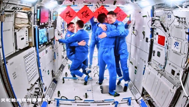 2024年4月26日5时04分,在轨执行任务的神舟十七号航天员乘组顺利打开“家门”,欢迎远道而来的神舟十八号航天员乘组入驻“天宫”。随后,两个航天员乘组拍下“全家福”,共同向牵挂他们的全国人民报平安。