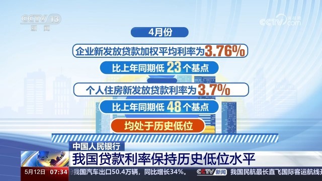 4月份企业新发放贷款加权平均利率为3.76%,比上年同期低23个基点;个人住房新发放贷款利率为3.7%,比上年同期低48个基点,均处于历史低位。