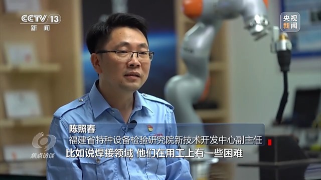 福建省特种设备检验研究院新技术开发中心副主任 陈照春:特种设备生产企业,比如焊接领域,在用工上有一些困难,因为焊接环境比较恶劣,现场温度比较高,有毒有害气体浓度也比较大,这个环境导致很多年轻人不愿意从事。我们想,能不能有一种智能化机器人在恶劣环境替代工人从事这些工作。