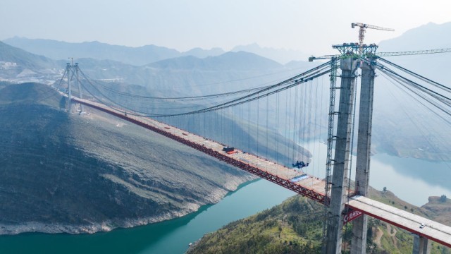 贵州交建集团投资建设的纳晴高速牂牁江大桥顺利实现合龙,为纳(雍)晴(隆)高速全线建成通车打下坚实基础(4月28日摄,无人机照片)。新华社记者 陶亮 摄