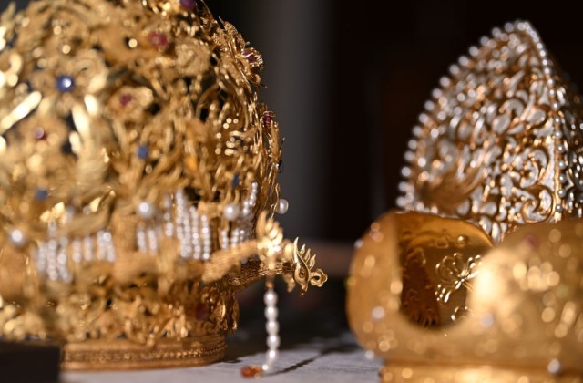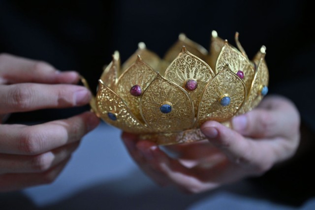 马赛在工作室内手拿莲花冠进行查看(3月19日摄)。新华社记者 李然 摄
