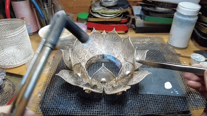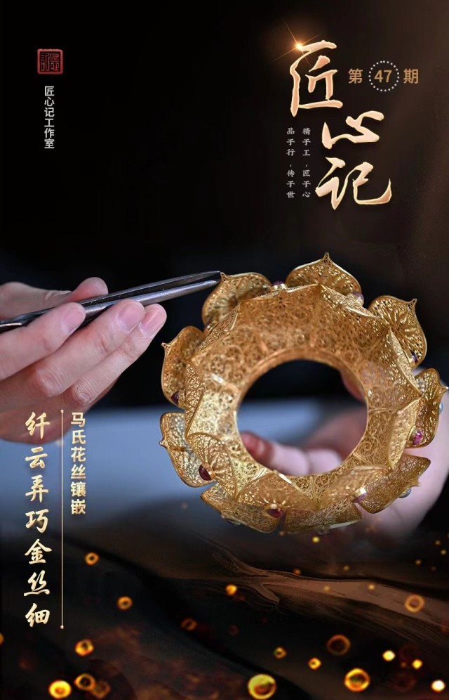 这是在天津市武清区崔黄口镇幌刘庄村的工作室拍摄的马赛制作的花丝镶嵌作品(4月25日摄)。新华社记者 李然 摄
