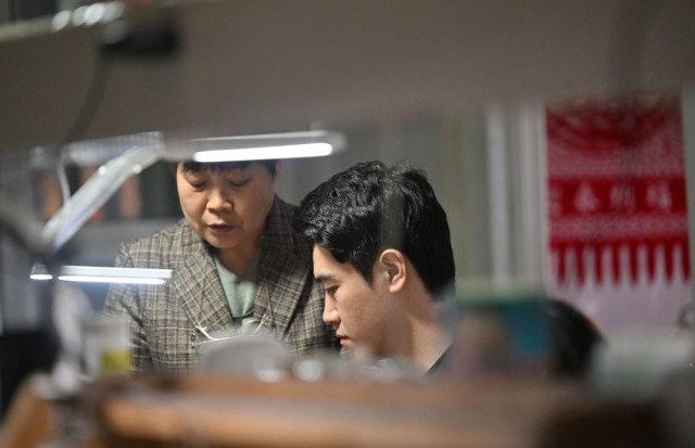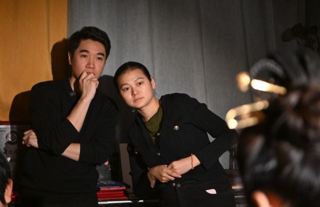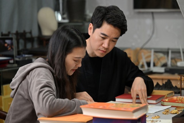 马赛(左)在工作室内与女朋友闵方苹在汉服爱好者佩戴头饰时商讨制作细节(3月7日摄)。新华社记者 孙凡越摄
