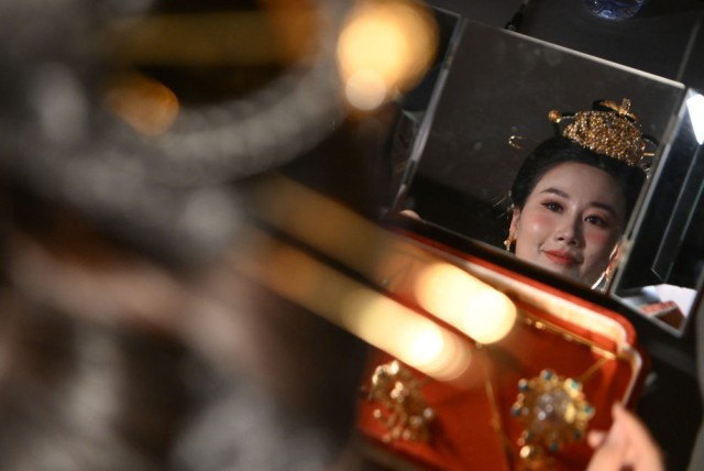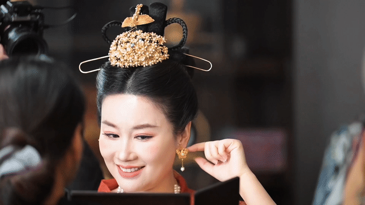 马赛在工作室内给一位汉服爱好者佩戴头饰(3月7日摄)。新华社记者 李然 摄