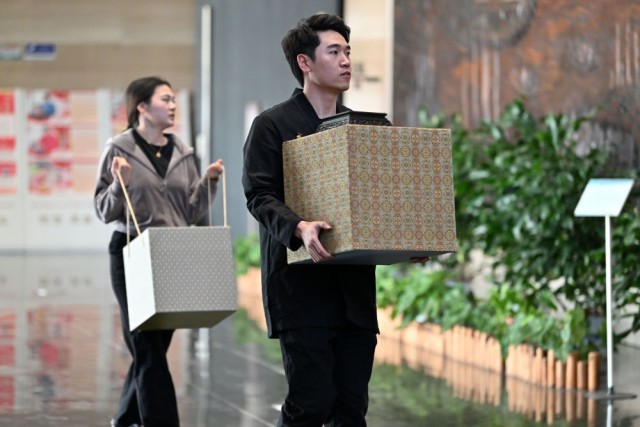 马赛(右)和女朋友闵方苹(左)在天津市武清区博物馆搬运展品(3月19日摄)。新华社记者 李然 摄
