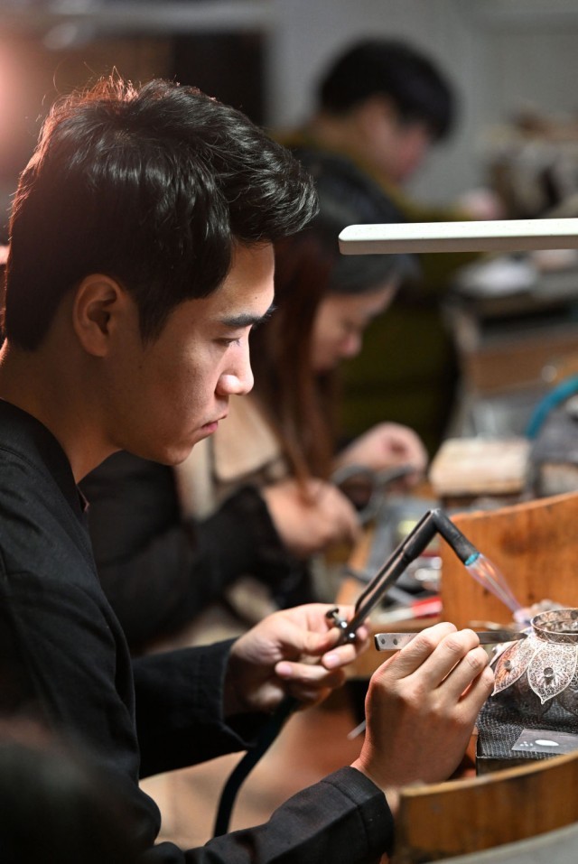 3月19日,马赛在天津市武清区崔黄口镇幌刘庄村的工作室内进行手工拉丝。