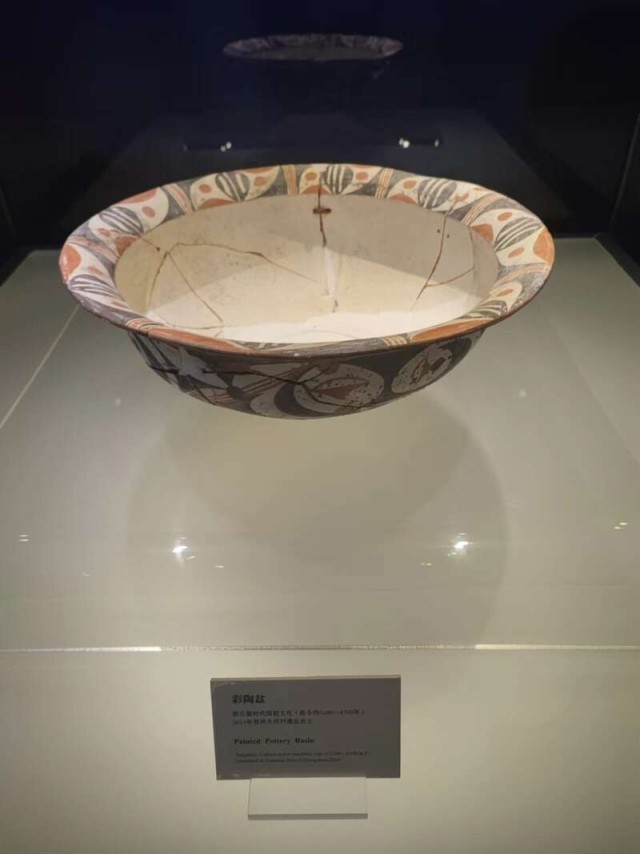 大河村遗址博物馆内陈列的彩陶盆。中青报·中青网记者 潘志贤/摄