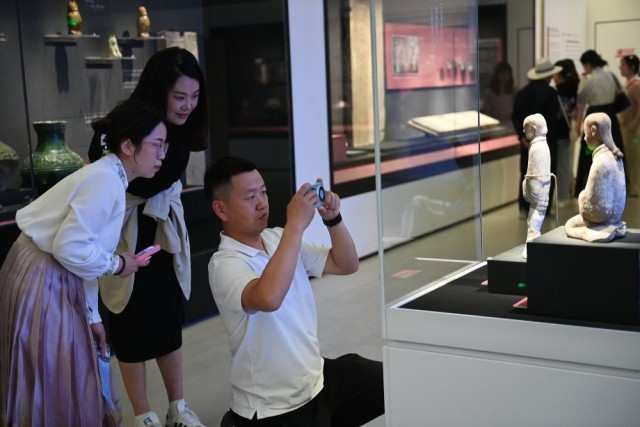 2024年5月6日,观众在陕西历史博物馆秦汉馆拍摄汉代彩绘陶俑。新华社记者 李一博 摄