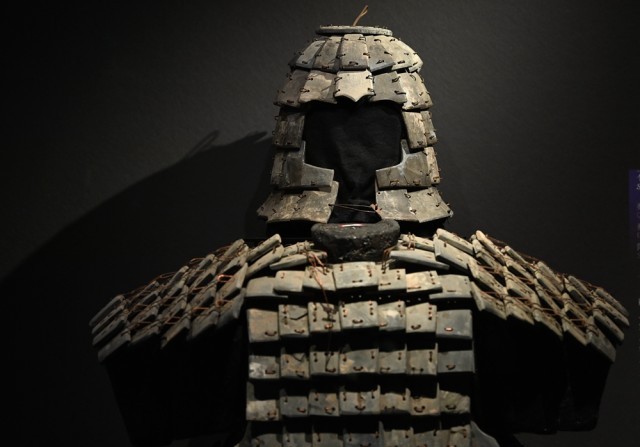 陕西历史博物馆秦汉馆内展出的石铠甲及石胄(2024年5月6日摄)。新华社记者 李一博 摄