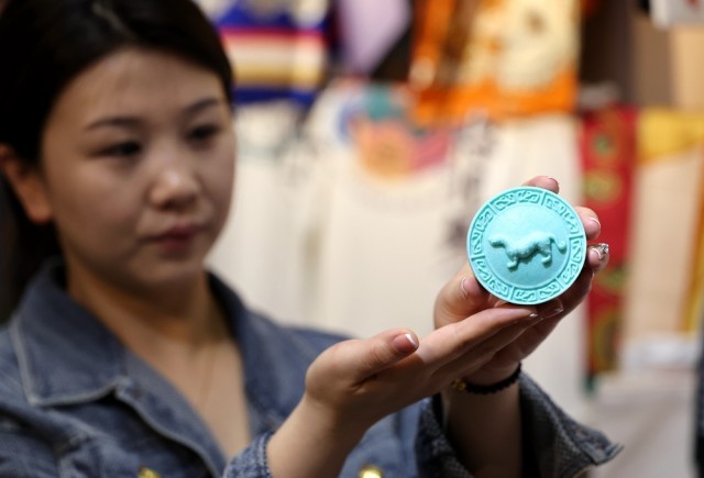 2024年4月23日,秦汉新城新丝路数字文化科技有限公司的工作人员展示一款由杜虎符开发而成的文创手工皂。新华社记者 李一博 摄