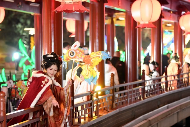 2024年2月2日,游客在西安大唐芙蓉园观看长安灯会。新华社记者 李一博 摄